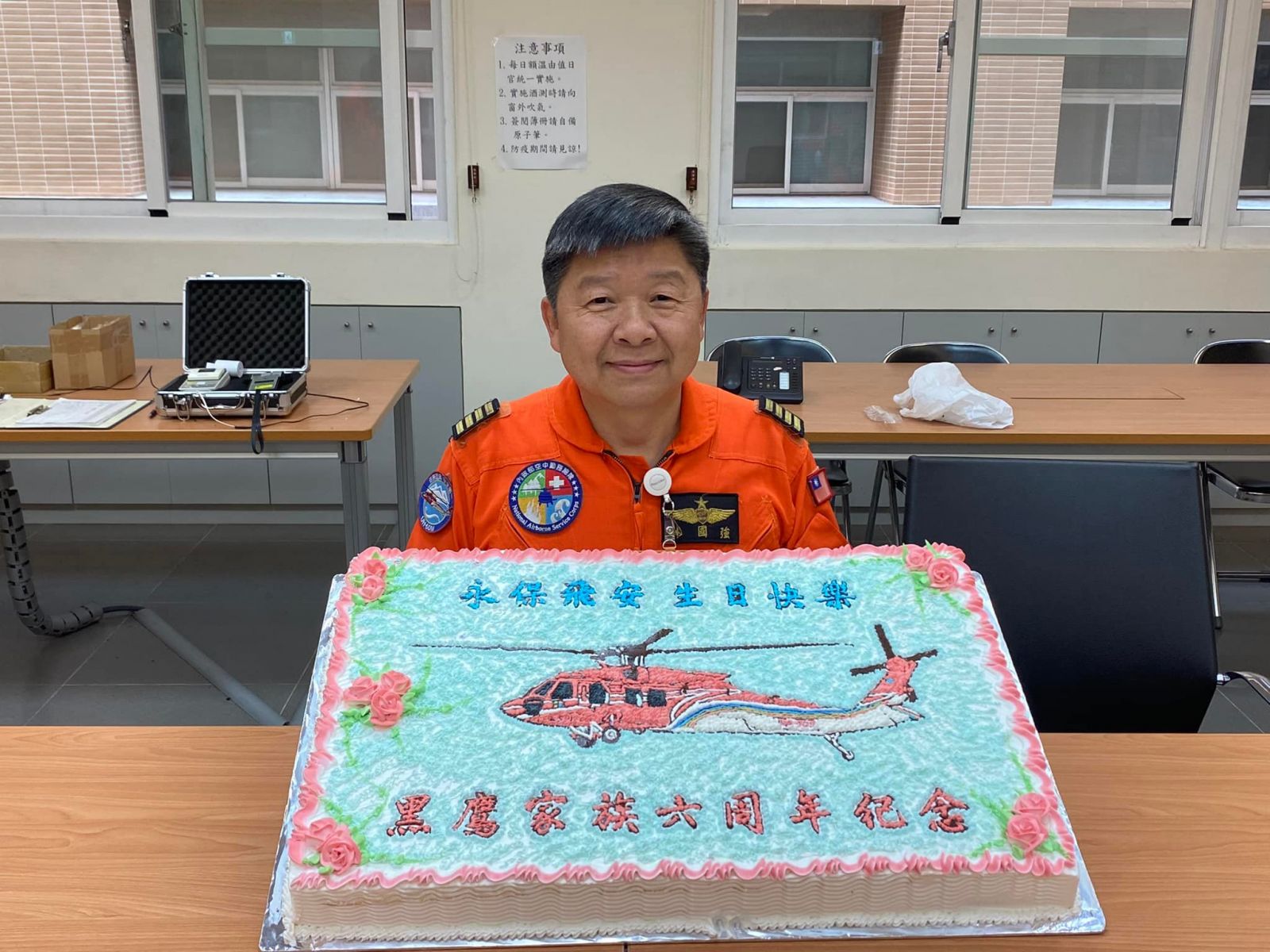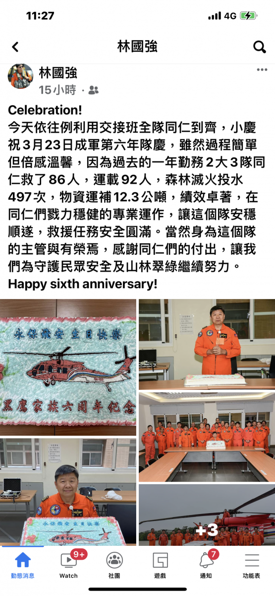 今天依往例利用交接班全隊同仁到齊,小慶祝3月23日成軍第六年隊慶,雖然過程簡單但倍感溫馨,因為過去的一年勤務2大3隊同仁救了86人,運載92人,森林滅火投水497次,物資運補12.3公噸,績效卓著,在同仁們戮力穩健的專業運作,讓這個隊安穩順遂,救援任務安全圓滿。當然身為這個隊的主管與有榮焉,感謝同仁們的付出,讓我們為守護民眾安全及山林翠綠繼續努力。