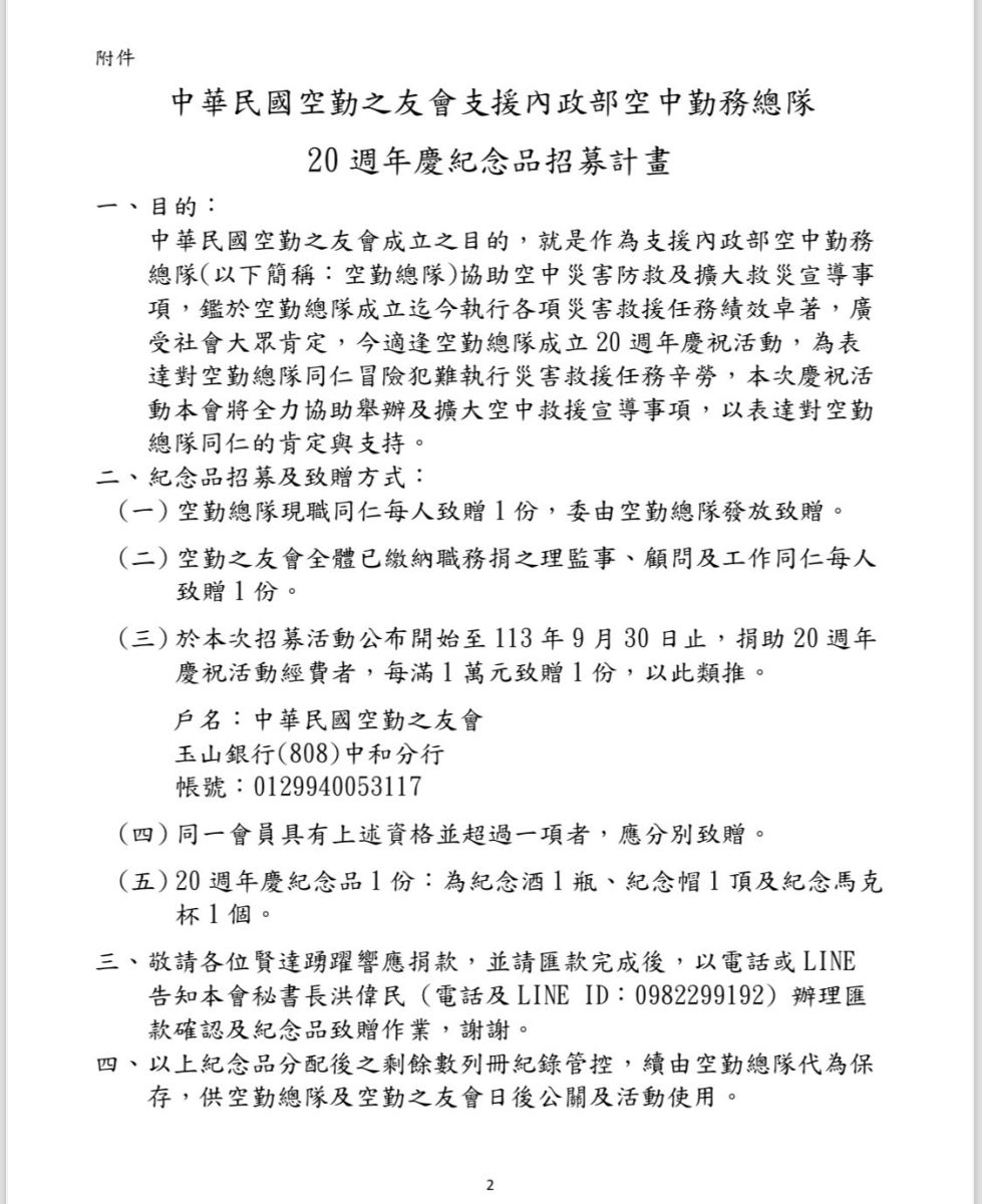 中華民國空勤之友會支援內政部空中勤務總隊20週年慶紀念品招募計畫