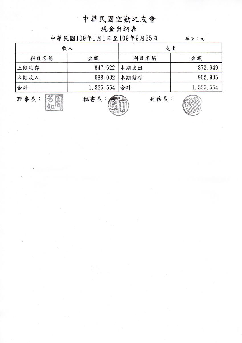 中華民國空勤之友會109年度現金出納表(109.01.01-109.09.25)