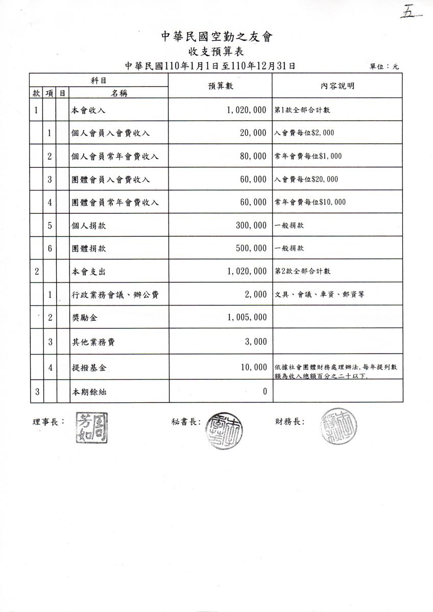 中華民國空勤之友會110年度收支預算表(110.01.01-110.12.31)