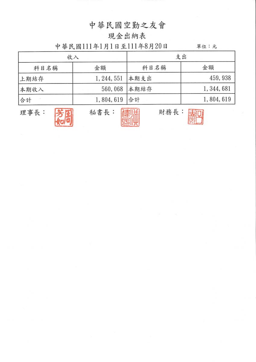 中華民國空勤之友會111年度現金出納表(111.01.01-111.08.20)