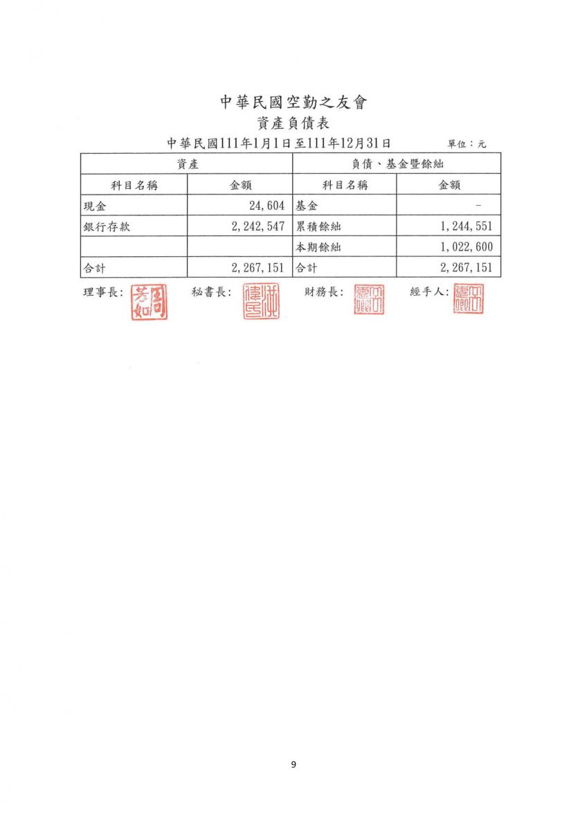 中華民國空勤之友會111年度資產負債表(111.01.01-111.12.31)