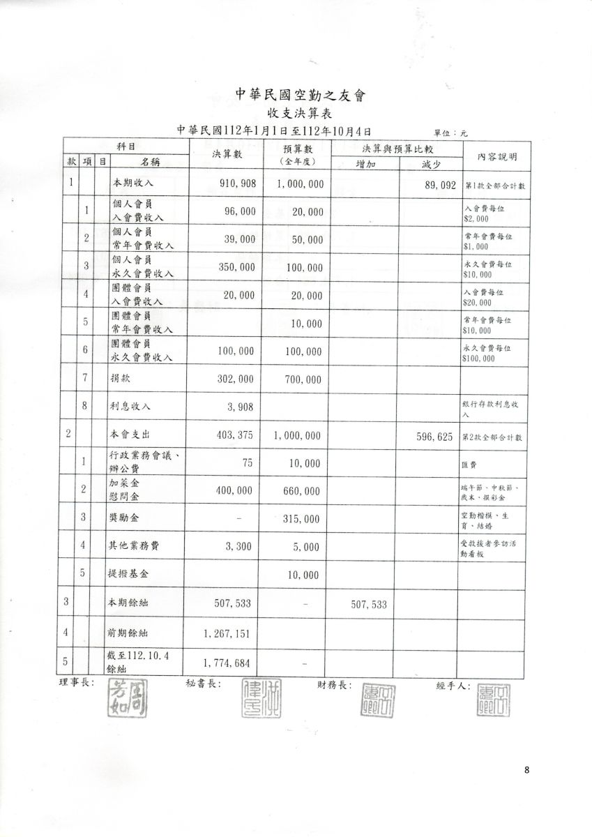 中華民國空勤之友會112年度收支決算表(112.01.01-112.10.04)
