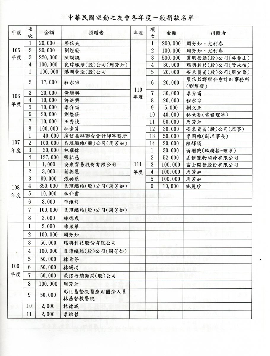 中華民國空勤之友會各年度一班捐款名單(105年-111年)